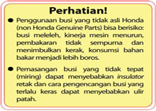 Keunggulan Busi Honda Insulator terbuat dari keramik alumunium bermutu tinggi. Diantara lekukan Metal Shell dan dasar Insulator terdapat bubuk yangberfungsi sebagai pelekat dan pencegah kebocoran gas dari ruang pembakaran. Metal Shell (Rumah Busi) terbuat dari besi baja yang kuat & tahan panas Di dalam insulator tertanam elektroda tengah dari tembaga agar dapat menghantarkan listrik & panas dengan baik. Ujung Elektroda tengah dan samping terbuat dari Nickel Alloy yang tahan panas |