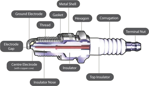 Spark Plug - Busi Fungsi Busi: 1. Membakar campuran bahan bakar dan udara yang masuk ke dalam ruang pembakaran (Ignition) 2. Menghantarkan energi panas keluar dari ruang pembakaran (Transfer). 3. Indikator pembakaran pada mesin. > |